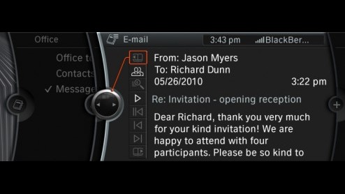 Met BMW ConnectedDrive hebben de Duitsers een elektronische, persoonlijke assistent in het leveren geroepen die de bestuurder in verbinding stelt met zijn of haar omgeving. Dit najaar worden de communicatiemodelijkheden uitgebreid met een e-mailfunctie via Bluetooth. Daardoor kunnen emails afkomstig van de nieuwste BlackBerry smartphones via iDrive worden ontvangen. De optionele spraakfunctie kan de inkomende berichten ook voorlezen. Het systeem wordt ook in Nederland leverbaar.