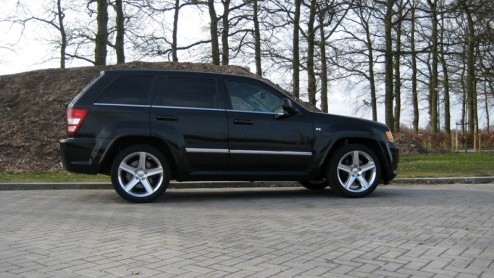 Fast in a straight line is ook niet alles, hoor ik je denken. Klopt! De Grand Cherokee is geen bochtenridder. Ruim twee ton de bocht in sleuren is sowieso een flinke klus, maar bij de Jeep gooit de de relatief zware besturing roet in het eten. Het forse stuurwiel is geen precisie-instrument waarmee je eens lekker scherp een bocht aan kan snijden. We hadden eigenlijk niet anders verwacht, dit moet je gewoon niet willen. Bovendien zijn de stoelen daar niet stevig genoeg voor gevormd, al kunnen we dat enigszins begrijpen: een coureur neemt geen plaats in een kolos als deze. Van de doorgaans comfortabele afstemming van het onderstel blijft na bemoeienis van de Street and Racing Technology-divison een stuk minder over. Het moest vooral lager (drie centimeter) en veel stugger, maar zoals we gezien hebben is dat niet automatisch een garantie voor succes op de weg. Ook de shiny wheels doen nog een duit uit het zakje. Maarja, het oog wil ook wat....