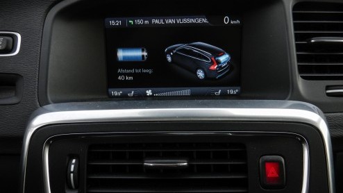 De innige samenwerking tussen de benzine- en elektromotor wordt inzichtelijk gemaakt via het vertrouwde TFT-scherm van Volvo Sensus. Maar omdat dat scherm natuurlijk ook bedoeld is voor navigatieweergave en audio, gebruikt Volvo het Chrystal TFT-instrumentarium uit de nieuwe V40 om je als bestuurder verder te informeren. Afhankelijk van het weergavethema – er is keuze uit ECO, Elegance of Performance – laat een meter precies zien hoeveel elektrische energie er gevraagd wordt en beschikbaar is. Wie daar een beetje goed op let kan precies ‘zien’ wanneer de D5 erbij wordt geroepen en wanneer niet. Toch leuk om te weten, want voelen doe je het dus nauwelijks of niet.